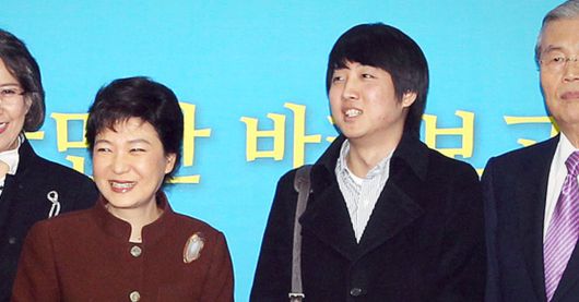 지난 2011년 12월 27일 당시 한나라당 첫 비상대책위 회의 모습. 박근혜 전 대통령(왼쪽·당시 한나라당 비상대책위원장)과 이준석 전 최고위원(당시 클라세스튜디오 대표). 중앙포토 |