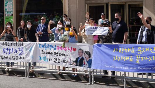 청와대에 따르면 20일(이하 현지시간) 문 대통령이 숙소로 이용하고 있는 호텔 앞에는 현지 교민들이 나와 문 대통령의 미국 방문을 환영했다.