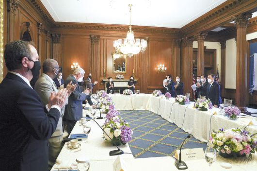 특히 이날 간담회에서는 중국에 관한 얘기도 나오지 않았다. 청와대 고위 관계자는 중국 얘기가 나오지 않았냐는 기자들의 질문에 “(문 대통령과 하원 의원들이) 오늘 주고받은 얘기는 지금 공개한 정도”라고만 말했다. 이날 정만호 국민소통수석이 공개한 간담회 내용에는 문 대통령과 하원 의원들은 백신과 반도체에 대한 직접적인 언급을 하지 않고, 한미동맹 중요성과 발전, 민주주의에 대해서만 주로 언급했다.