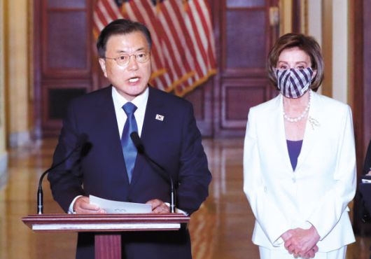 문 대통령은 이날 낸시 펠로시 미국 연방하원의장 등 하원 지도부와의 간담회 자리에서 한미 양국의 의회와 민주주의를 평가하면서 “민주주의의 바탕에는 굳건한 한미동맹이 있었고, 한국이 어려울 때 언제나 함께해 준 미 의회의 신뢰와 지지가 큰 힘이 되었다”고 말했다. 문 대통령은 또 한반도 비핵화와 항구적 평화, 기후변화 대응에서도 미 의회의 지지를 당부했다. ▶관련기사 4면