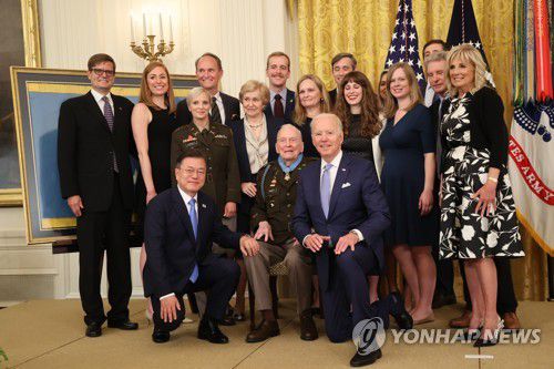 (워싱턴·서울=연합뉴스) 공동취재단·임형섭 조민정 기자 = 문재인 대통령과 조 바이든 미국 대통령은 21일 오후(현지시간) 백악관에서 열린 한국전 참전용사 명예훈장 수여식에 나란히 참석했다.