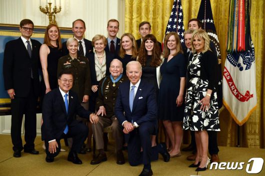 문재인 대통령과 조 바이든 미국 대통령이 21일(현지시간) 백악관 이스트룸에서 개최된 명예훈장 수여식에서 훈장의 주인공인 랄프 퍼켓 예비역 대령과 기념촬영을 하고 있다. © AFP=뉴스1 |