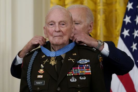바이든 대통령은 이날 백악관에서 94세의 한국전쟁 영웅 랠프 퍼켓 주니어 예비역 대령에게 미국 최고의 영예인 명예훈장을 수여했다.