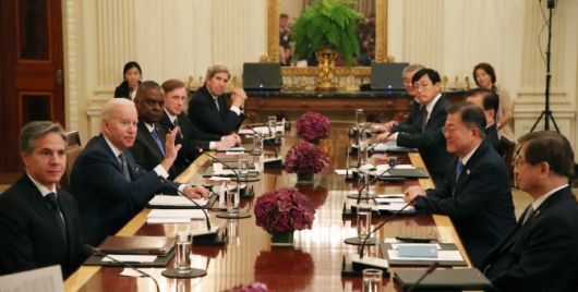 문재인 대통령과 조 바이든 미국 대통령이 21일 오후(현지시간) 백악관 국빈만찬장에서 확대회담을 하고 있다. (사진=연합뉴스) |