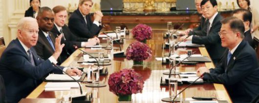 [워싱턴=뉴시스]추상철 기자 = 문재인 대통령과 조 바이든 미국 대통령이 21일 오후(현지시간) 미국 워싱턴 백악관 국빈만찬장에서 한-미 정상 확대회담을 하고 있다. 2021.05.22. scchoo@newsis.com <저작권자ⓒ 공감언론 뉴시스통신사. 무단전재-재배포 금지.> /사진=뉴시스화상 |
