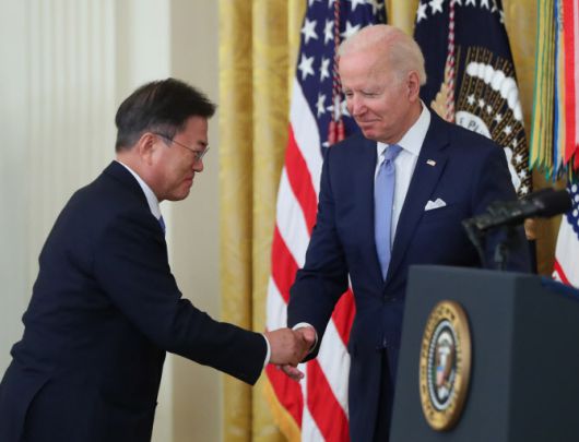 문재인 대통령과 조 바이든 대통령이 21일 오후(현지시간) 미국 워싱턴 백악관 이스트룸에서 열린 한국전쟁 명예 훈장 수여식에서 인사하고 있다. (사진=연합뉴스 제공) |