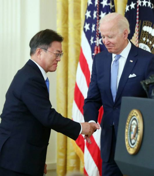 또 문 대통령은 한미 확대정상회담 모두발언에서 "미국이 바이든 대통령의 리더십에 의해 코로나 극복과 경제 회복, 국민통합에서 성공을 거두며 세계의 모범이 되고 있는 것을 축하한다"고 했다.