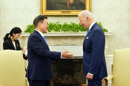 미국을 방문 중인 문재인 대통령이 21일 오후(현지시간) 백악관 오벌오피스에서 조 바이든 미국 대통령과 열린 소인수 회담을 하고있다. 연합뉴스 |