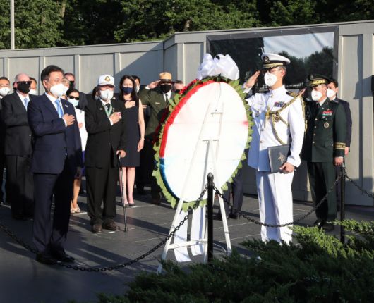또 “참전용사와 유가족 여러분. 나는 오늘 바이든 대통령님이 취임사에서 말씀하신 힘의 모범이 아닌 모범의 힘을 보여주는 위대한 미국을 떠올린다. 미국은 가치의 힘으로 세계를 바꿨다”고 평가했다. 이어 “나라의 주인은 국민이며 차별 없이 누구나 자유롭고 평등해야 한다는 미국의 건국 이념은 세계의 보편적 가치가 됐다”며 “한국 역시 그 가치의 힘으로 식민지와 전쟁, 독재와 빈곤을 극복하고 두려움이 아닌 희망의 이야기를 써올 수 있었다”고 회상했다.