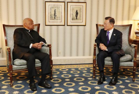 문재인 대통령이 22일 오전(현지시간) 미국 워싱턴 한 호텔에서 윌튼 그레고리 추기경 겸 워싱턴 대주교를 면담하고 있다. (사진=연합뉴스) |