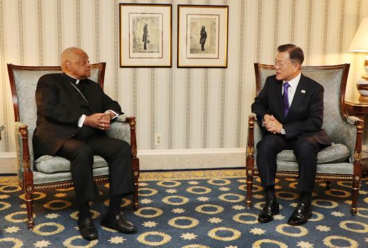 [헤럴드경제=워싱턴 공동취재단·서울 박병국 기자]방미중인 문재인 대통령이 22일 (현지시간) 윌튼 그레고리 추기경을 면담했다.