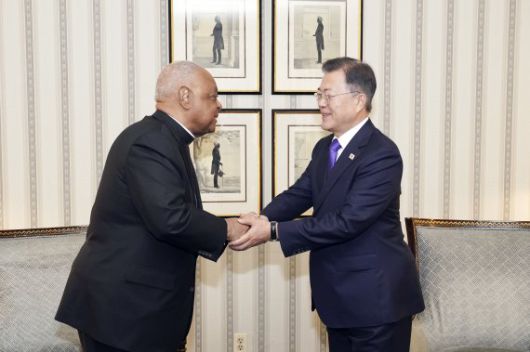 [파이낸셜뉴스] 미국을 공식 방문 중인 문재인 대통령은 22일(현지시간) 윌튼 그레고리 추기경 겸 워싱턴 대교구 대주교를 면담하고 한반도 평화, 인종 간 화합, 코로나19 대응 등에 대해 의견을 교환했다.