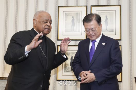문 대통령은 워싱턴 시내 한 호텔에서 그레고리 추기경을 만나 한반도의 평화, 인종 간 화합, 코로나19 대응 등에 대해 의견을 교환했다.
