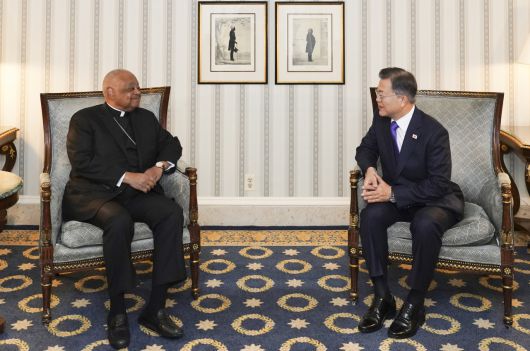 문 대통령은 이날 오전 워싱턴DC의 한 호텔에서 윌튼 그레고리 추기경을 면담하고 "2018년 10월 로마를 방문해 교황님을 뵈었는데, 한반도 통일을 축원하는 특별미사를 봉헌해 주시는 등 한반도 평화와 통일에 많은 관심을 보여 주셨다”며 이같이 말했다. 그레고리 추기경은 지난해 10월 임명된 미국 최초의 흑인 추기경이다.