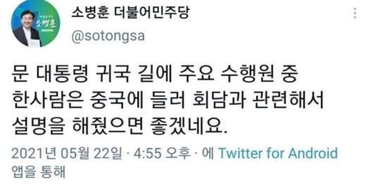 소병훈 더불어민주당 의원이 지난 21일(현지시간) 있었던 한미 정상회담과 관련해 "문재인 대통령 귀국 길에 주요 수행원 중 한 사람은 중국에 들러 회담과 관련해서 설명을 해줬으면 좋겠다"고 밝혔다.