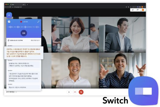 화상회의 텍스트 기록 서비스는 구글 미트 화상회의를 기록하는 크롬 확장 프로그램에서 시작해, 줌·팀즈 등으로 확대해 나갈 계획이다. 구글 미트 적용 서비스는 스위치 로그인 계정이 있는 사용자라면 누구나 무료로 이용 가능하며, 구글 미트를 실행한 후 나타나는 상단의 스위치 아이콘을 누르면 기록 기능이 활성화된다. 화상회의가 진행되는 동안 모든 음성 내용이 녹음되는 동시에 실시간 문자로 변환되며, 중요한 부분은 하이라이트 표기를 할 수 있고, 회의가 끝나면 자동으로 노트가 생성된다. 특히, 다수의 화자로 이루어진 음성을 개별 음성으로 분리해냈는데, 최대 4명까지 화자 분리를 자동 진행한다.