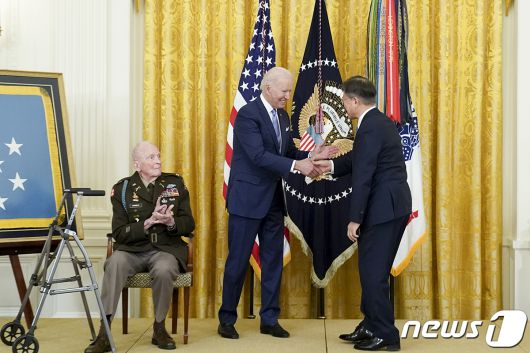 문재인 대통령이 21일 오후(현지시간) 미국 워싱턴 백악관에서 열린 한국전쟁 참전용사 랄프 퍼켓(Ralph Puckett) 예비역 대령의 명예훈장 수여식에서 연설을 마친 후 조 바이든 대통령과 악수하고 있다.(청와대 제공) 2021.5.22/뉴스1 |
