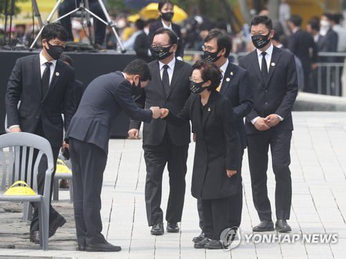 김 대표 대행은 특히 추도식장에 입장하는 권 여사에게 깊이 고개를 숙여 깍듯이 예를 표한 뒤 '주먹 악수'를 했다.