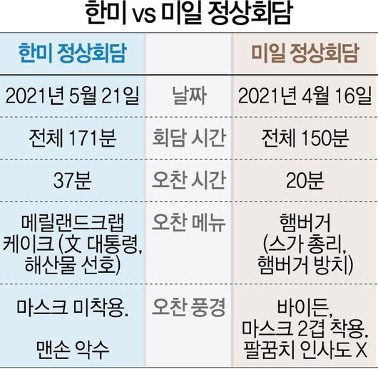 이날 오찬 메뉴도 미일정상회담에 비해 정성스럽다는 평가를 받았다. 두 정상은 소형의 원형 테이블에 마주 보고 앉아 서로의 표정을 확인하면서 대화를 나눴다. 문 대통령은 37분간 오찬 겸 진행된 단독회담에서 ‘메릴랜드 크랩 케이크’를 대접받았다. 해산물을 좋아하는 문 대통령의 식성을 고려해 준비된 메뉴였다. 이에 양무진 북한대학원대 교수는 한미정상회담 분위기를 두고 “그동안의 한미 동맹에 대한 우려를 불식시킨 회담이었다”며 “총 3시간의 정상회담이 훈훈한 분위기 속 한미 간 모든 의제가 다뤄진 것”이라고 호평했다. 반면 스가 총리는 당시 오찬 메뉴로 나온 햄버거에 손도 대지 않았다. 미일 두 정상은 2m가량의 긴 테이블 양 끝에 앉은 채 약 20분 내로 오찬을 끝냈다.