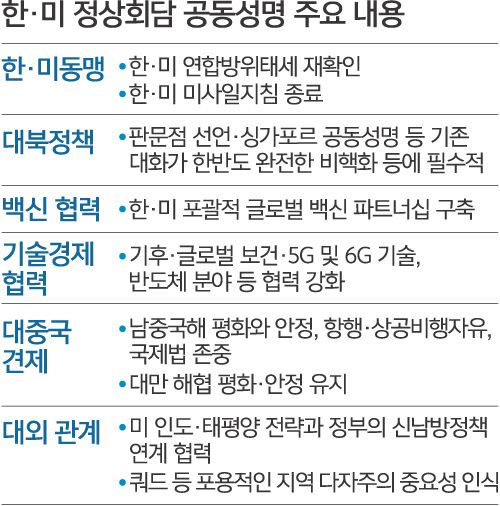 22일(현지시간) 발표된 한·미 정상회담 공동성명에는 대만해협, 남중국해 등 미·중 갈등 구도에서 중국이 민감해하는 사안이 다수 들어갔다. 그간 미·중 갈등에서 조심스러운 태도를 보여온 우리 정부가 미국의 입장을 상당 부분 반영한 것이다.