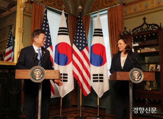 문 대통령은 당시 백악관을 방문해 부통령실이 있는 아이젠하워 행정동에서 해리스 부통령과 만났다. 두 사람은 회담에 앞서 취재진을 앞에 두고 소감을 밝혔다. 백악관이 공개한 당시 영상을 보면 먼저 발언에 나선 해리스 부통령은 “세계가 지금 보건, 안보, 기후 등 점증하는 위협에 당면한 상황에서 미국과 한국이 긴밀히 공조하는 것은 그 어느 때보다 중요하다”면서 “양국은 공통의 경제적·민주적 가치, 우애와 가족, 문화와 역사로 연결이 돼 있다”고 말했다. 문 대통령은 “바이든·해리스 정부가 세계에서 가장 성공적인 백신 접종과 경제 회복으로 더 나은 재건을 실현하면서 미국의 정신을 되살려 포용과 통합의 길을 걷고 있는 것에 축하의 말씀을 드린다”면서 “미국의 정신은 지난 70년 자유와 민주주의를 위해 함께 피흘리며 싸워온 한·미 동맹의 역사에도 고스란히 배어있다”고 말했다. 문 대통령은 “한국은 가치를 공유하는 책임 동맹으로 코로나 극복과 자유민주주의적 국제질서를 수호하기 위한 미국의 여정에 늘 함께할 것”이라면서 “미국의 강력한 기후변화 대응을 지지하며 한반도의 완전한 비핵화와 항구적 평화를 위해서도 빈틈없이 공조할 것”이라고 말했다.