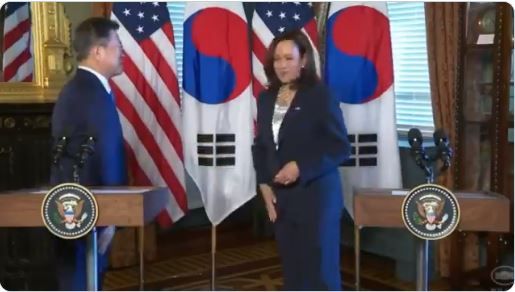 미국 네티즌들의 논란은 모두발언이 끝난 직후 문 대통령과 해리스 부통령이 악수를 한 장면을 놓고 벌어졌다.