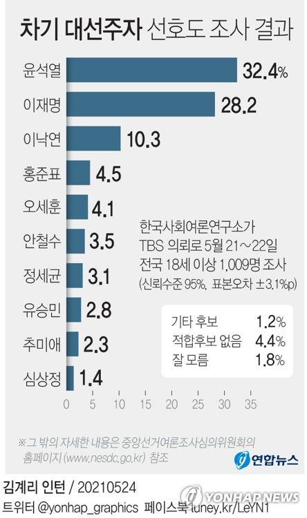 한국사회여론연구소가 TBS 의뢰로 지난 21~22일 전국 만 18세 이상 1천9명을 대상으로 조사한 결과, 차기 대선후보 적합도에서 윤 전 총장은 32.4%를 기록하며 이 지사(28.2%)를 오차범위 내에서 앞섰다.