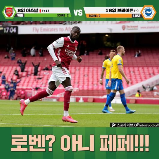 니콜라스 페페가 아스널을 승리로 이끌었다. 아스널은 24일 0시 영국 런던에 위치한 에미레이츠 스타디움에서 열린 2020-21시즌 EPL 38라운드 최종전에서 브라이튼에 2-0으로 승리했다.
