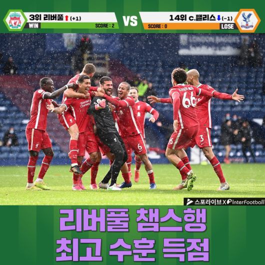 리버풀이 EPL 3위로 시즌을 마무리했다. 리버풀은 24일 0시 영국 리버풀에 위치한 안필드에서 열린 2020-21시즌 EPL 38라운드에서 크리스탈 팰리스를 2-0으로 제압했다. 이로써 리버풀은 승점 3점을 더해 리그 3위로 올라섰고, 다음 시즌 유럽축구연맹(UEFA) 챔피언스리그(UCL) 진출을 확정했다.