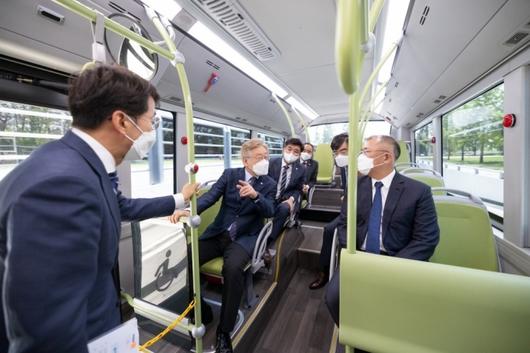 이재명 경기도지사가 24일 경기 화성시 현대자동차·기아기술연구소에서 정의선 현대자동차그룹 회장, 김병욱 민주당 의원 등과 만나는 모습. / 사진제공=김병욱 의원실 |