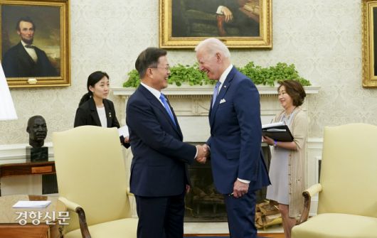 문재인 대통령이 21일 오후(현지시간) 미국 워싱턴 백악관 오벌오피스에서 열린 소인수 회담에 참석해 조 바이든 미국 대통령과 악수를 하고 있다. 워싱턴 강윤중 기자 |