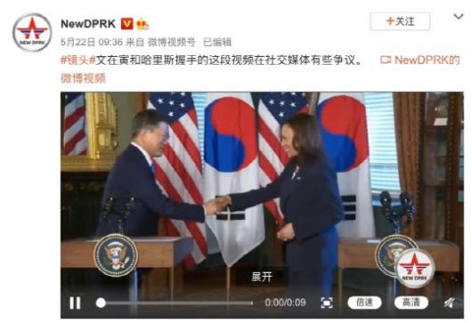 북한이 운영하는 것으로 추정되는 ‘NewDPRK’ 웨이보 계정이 지난 22일 문재인 대통령과 카멀라 해리스 미국 부통령의 악수 영상을 게시하면서 “소셜미디어에서 다소 논란이 되고 있다”고 소개했다(사진=웨이보 계정 캡처/연합뉴스). |
