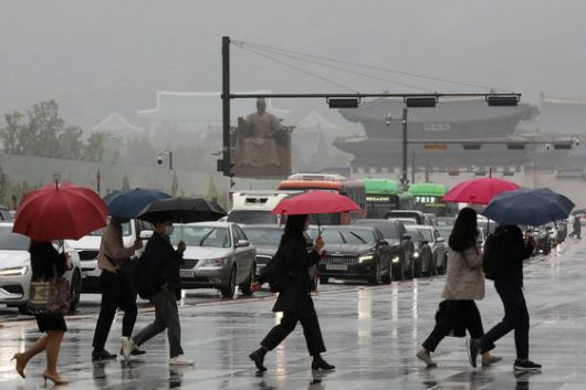 전국 대부분 지역에 '황사비'가 내린 25일 오전 서울 종로구 광화문 네거리에서 우산을 쓴 시민들이 출근길 발걸음을 재촉하고 있다. 뉴스1 |