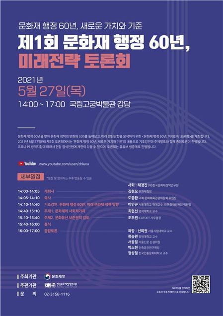 첫 토론회는 오는 27일 국립고궁박물관에서 한다. 주제는 '문화재 행정 60년, 새로운 가치와 기준.' 김현모 문화재청장이 개회사, 도종환 국회 문화체육관광위원회 위원장이 축사를 각각 맡는다. 기조 강연은 이인규 서울대 명예교수가 담당한다. 지난 60년 동안 이뤄진 문화재 정책 성과를 회고하고 앞으로 문화재 행정이 추구할 방향성을 제시한다.