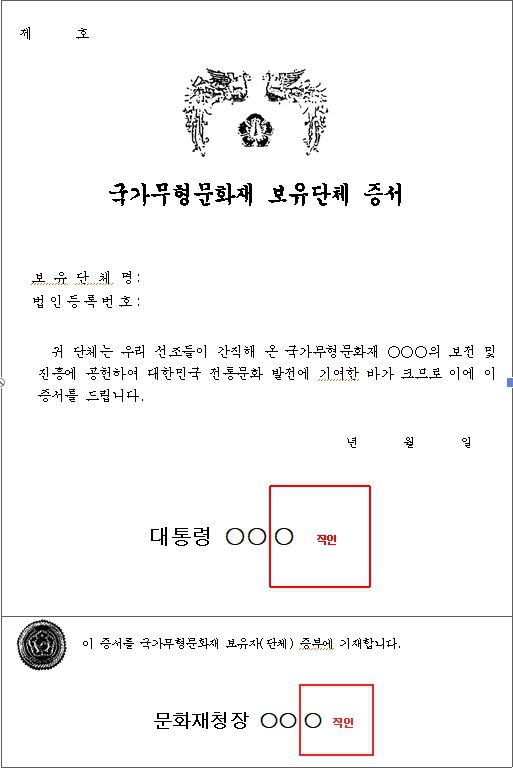 앞으로는 국가무형문화재 보유자와 보유단체에 문화재청장 명의 인정서와 함께 대통령 명의 증서가 별도로 수여된다. 문화재청은 이 같은 내용의 무형문화재 보전 및 진흥에 관한 법률 시행령을 25일 공포하고 내달 23일부터 시행한다.