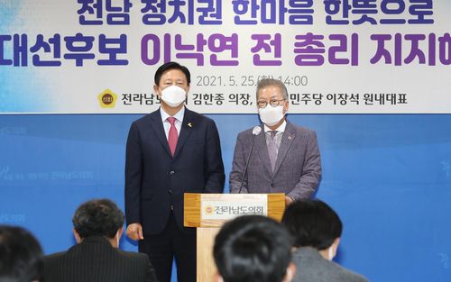 김 의장 등은 "전남도의회 더불어민주당 소속 의원들은 이낙연 전 총리를 적극적으로 지지하면서, 전남지역 국회의원들은 물론 22개 시·군의원들도 단합된 모습을 보여 줄 것을 강력히 희망한다"고 말했다.
