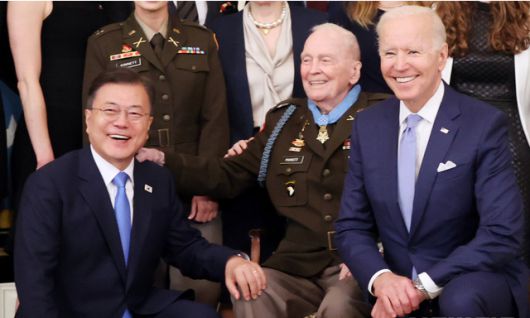 문 대통령은 지난 21일(현지시간) 바이든 대통령이 백악관에서 한국전쟁 당시 중공군에 맞서 활약한 랠프 퍼켓 주니어(94) 퇴역 대령에게 미군 최고의 영예인 명예훈장을 수여하는 자리에 참석해 무릎을 꿇고 기념촬영을 했다.