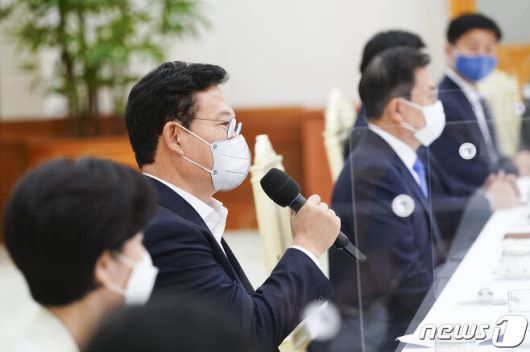 송영길 더불어민주당 대표가 14일 오전 청와대에서 열린 더불어민주당 지도부 초청 간담회에서 발언하고 있다. 2021.5.14/뉴스1 (C) News1 이광호 기자 |