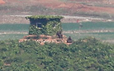 지난 2일 오전 경기도 파주시 오두산통일전망대에서 바라본 북한 개풍군 마을 일대 초소에서 북한군이 휴식을 취하고 있다(사진=뉴스1). |