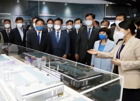 더불어민주당이 26일 미국 모더나와 코로나19 백신 위탁생산 계약을 맺은 삼성바이오로직스의 인천시 연수구 송도 2공장에서 현장 최고위원회의를 개최한 가운데, 송영길 대표(앞줄 오른쪽 세번째), 윤호중 원내대표(앞줄 오른쪽 네번째) 등 지도부가 공장 홍보관을 둘러보고 있다. 이날 현장 방문은 한미정상회담 성과를 알리기 위해 마련됐다. 뉴스1 |