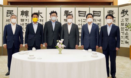 문재인 대통령이 26일 청와대에서 열린 여야 5당 대표 초청 오찬간담회에서 참석자들과 기념촬영을 하고 있다. 왼쪽부터 최강욱 열린민주당 대표, 여영국 정의당 대표, 송영길 더불어민주당 대표, 문 대통령, 김기현 국민의힘 대표 권한대행 겸 원내대표, 안철수 국민의당 대표. 뉴스1 |