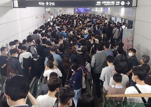 이번달 초 출근길 김포도시철도를 타기 위해 승객들이 줄을 서며 기다리고 있다. 독자 제공 |