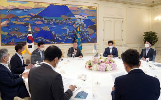 문 대통령이 이날 회동을 마친 뒤 참석자들에게 '화합' 넥타이를 선물한 것도 비슷한 맥락이다. 감색 바탕에 4가지 색(파랑·빨강·노랑·주황)이 사선으로 들어간 넥타이로, 문 대통령이 지난해 7월16일 국회 개원연설에서 착용한 넥타이와 같은 디자인이다.