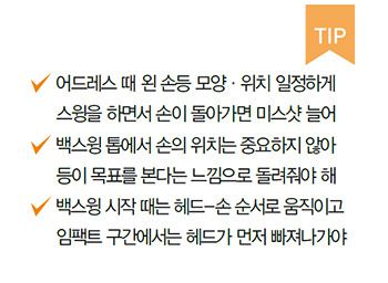 다음은 각 부분의 ‘타이밍’입니다. 많은 분이 슬라이스나 훅 구질로 고생하죠. 이에 대해서는 “스윙 순서를 지키는 것이 중요하다. 백스윙을 시작할 때 헤드가 가장 먼저 움직이게 된다. 당연히 다운스윙을 하고 임팩트 구간을 지나갈 때에도 가장 먼저 ‘클럽 헤드’가 먼저 빠져나가고 손이 뒤따라간다는 생각으로 스윙을 하면 일관성도 좋아지고 비거리도 늘어나게 된다”고 얘기합니다. 단순하면서도 정곡을 찌르는 스윙의 체크 포인트입니다.