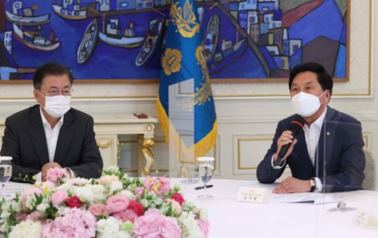 문재인 대통령이 26일 청와대에서 열린 문재인 대통령과 여야 대표 오찬간담회에서 국민의힘 김기현 대표 권한대행의 발언을 듣고 있다. 2021.5.26 [이미지출처=연합뉴스] |