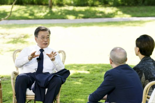 문재인 대통령이 지난 12일 청와대에서 배우 박진희, 방송인 타일러 라쉬와 P4G 정상회의 특별 대담을 하고 있다. 문 대통령은 이날 대담에서 P4G 서울 정상회의 및 탄소중립, 식량안보 및 기후변화, 제로웨이스트 실천 노력 등을 주제로 지구를 위한 대화를 나눴다.(사진=청와대) |