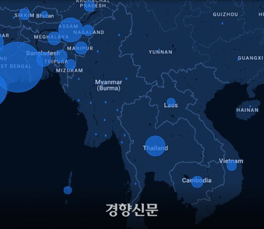 미얀마 주변 지역의 코로나19 확진자 발생 지도. 국경을 맞대고 있는 인도, 태국, 라오스에서 확진자가 증가하고 있는 가운데 미얀마만이 안정을 유지하고 있다. 구글 세계 코로나19 지도 갈무리 |