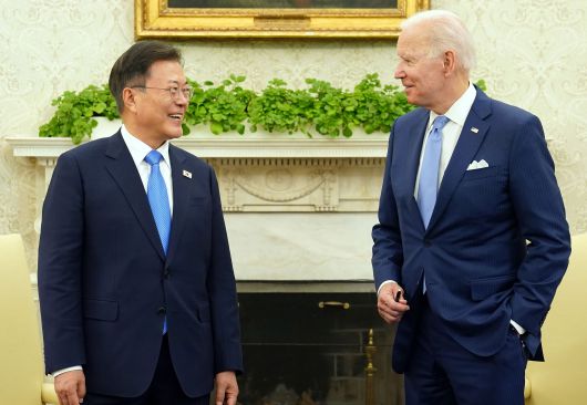 지난 21일(현지 시각) 문재인 대통령이 백악관 오벌오피스에서 열린 소인수 회담에서 조 바이든 미국 대통령과 대화하고 있다. /연합뉴스 |