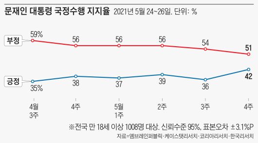 부정 평가 비율은 51%로 전주(54%) 대비 3%포인트 하락했다. 문 대통령의 지지율은 4월 첫째주 40%를 기록한 이후 줄곧 30%대를 유지해왔는데 7주만에 40%를 회복했다.