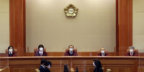 27일 종로구 헌법재판소 심판정에 유남석 헌재 소장과 재판관들이 앉아 있다./연합 |